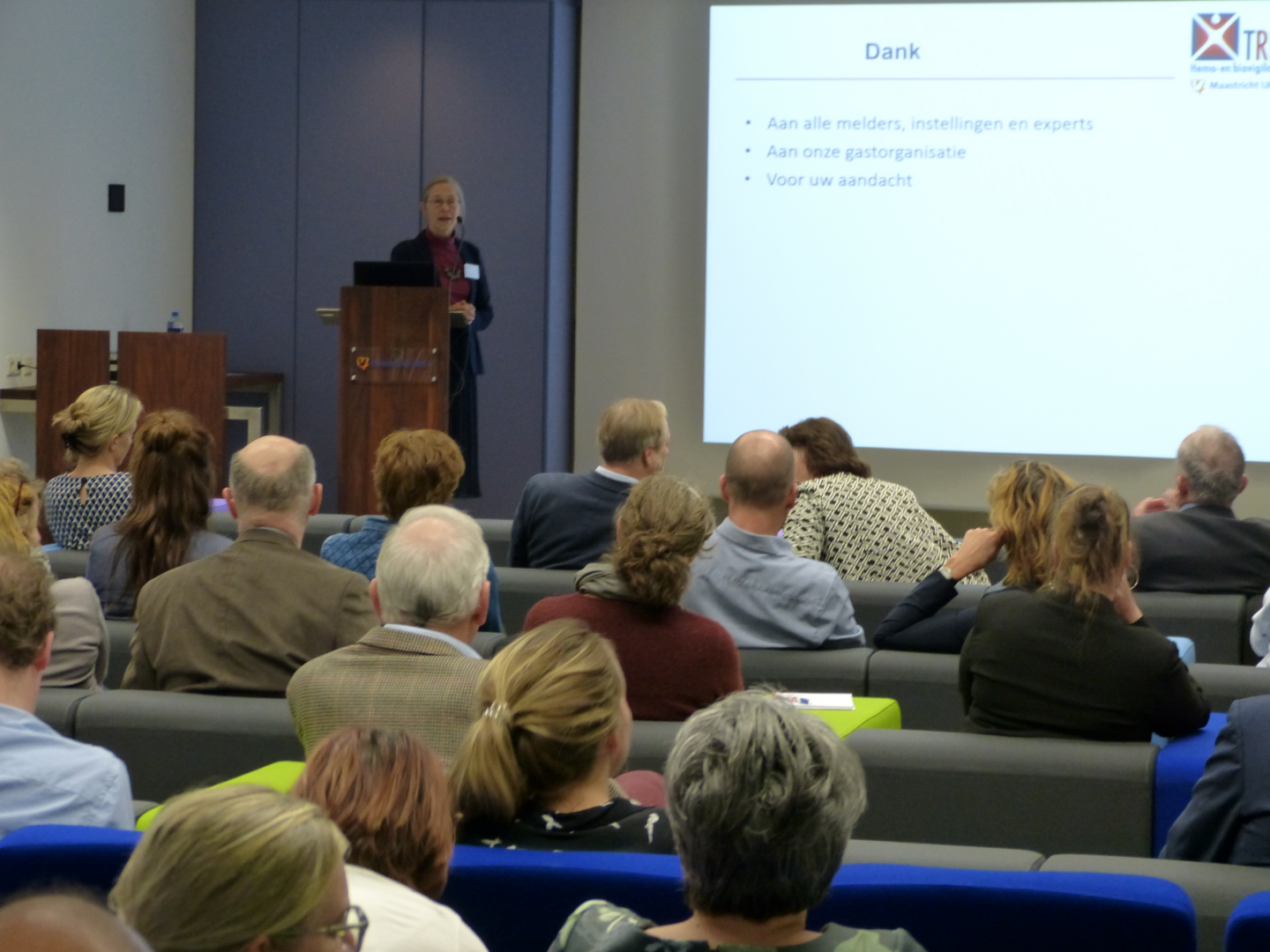 Hans Fiolet (directeur Patiënt & Zorg van het MUMC+) heeft de dag geopend met een woord van welkom en een korte presentatie over de implementatie van biovigilantie in het MUMC+ en werd gevolgd door Mor Dickman (corneatransplantatie en refractiechirurgie MUMC+) die een voordracht gaf over twee indrukwekkende revoluties binnen de corneatransplantaties in het afgelopen decennium (Descemet Membrane Endothelial Keratoplasty en gecultiveerde autologe limbale stamceltransplantatie). Wim de Jongh (regionaal teamleider NTS) nam ons vervolgens mee langs het traject van een donatieprocedure en liet daarbij zien hoeveel disciplines bij een dergelijk proces betrokken zijn. Hemo- en biovigilantiecoördinator van het MUMC+, Judith Lie, liet zien hoe haar functie vorm heeft gekregen binnen haar eigen organisatie, maar liet tevens zien dat dit bij verschillende ziekenhuizen heel anders van opzet kan zijn. Tineke Wind (transplantatie coördinator en research MUMC+) gaf ons een update over de huidige en toekomstige wetgeving rondom orgaandonatie. Als laatste voor de lunch deelde Marjan Happel (Coördinator biovigilantie bureau TRIP) de stand van zaken met betrekking tot de Single European Coding (SEC).