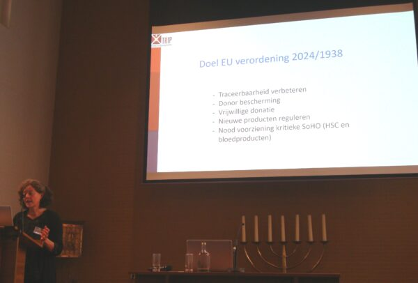 Het symposium werd geopend door Jaap Jan Zwaginga, directeur Bureau TRIP met eerst een korte vigilantie historie van Woerden, gevolgd door een samenvatting van het rapport Biovigilantie 2023. Zowel het korte als het uitgebreide rapport zijn te vinden op de website van TRIP. De participatie wat betreft het aanleveren van de jaarlijkse activiteit cijfers is volledig op het gebied van de reproductieve weefsels en cellen en de hemapoëtische stamcellen /cellen voor therapeutisch gebruik. Bij de overige weefsels en cellen zijn de toepassingscijfers niet compleet. Inmiddels is bekend dat de Europese verordening 2024/1938 over lichaamsmateriaal (Substances of Human Origin, SoHO) op 7 augustus 2027 van toepassing zal worden. De aanbevelingen dit jaar komen hieruit voort; kennisnemen van deze verordening en het in kaart brengen van de veranderingen voor de eigen organisatie. Het waarborgen van de traceerbaarheid van SoHO en het aanleveren van de jaarlijkse activiteitscijfers zal voor alle SoHO entiteiten verplicht worden.